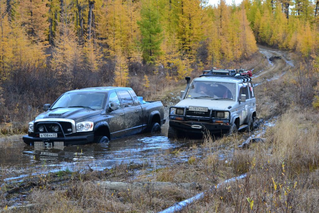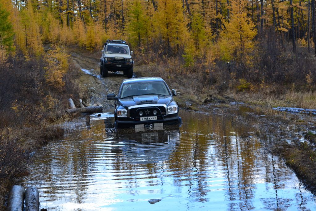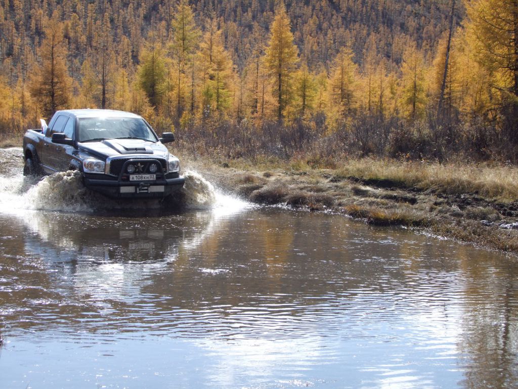 Додж долго не думая разгоняется всей своей тушей и берет эту лужу сходу. Все таки турбодизель в 6,7 литров это сила.