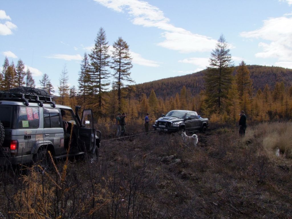 Очень быстро начинает темнеть. Еще 500 метров и мы должны встать на долгожданный сон. Ехали мы их 40 минут. В виду того что Мотос рванул по короткой дороге. Напрямик через болото. Где как обычно прилип по самый бампер Додж. Засада. Хоть бросай его. Сил нет уже ни каких. Разматываю лебедку на максимум и цепляю за сосну диаметром 30 см. Тянем потянем, вытянуть не можем. Сосна тихо мирно была вырвана с корнем. Так. Что то не так. Нет бы остановиться но некогда думать. Разматываю стропу и зацепляю за вторую сосну в диаметре уже см 50. Тянем тянем, вроде трос наматывается, а машина совсем по чуть чуть сдвигается вперед. Смотрю на его кузов, и ебическая сила, мост остался в говнище, а все остальное медленно вытягивается из болота. На вскидку лифт морды получился см 40. Все линки вытянулись в струнку. Лебедку на обратку и все встало на свои места. Вперед тянуть не пойдет. Объезжаю его и пытаюсь дернуть назад. Камап 9500 останавливается. Вот же зараза какая. Но все же с третьего раза удается помаленьку его вырвать из водного плена. По сухому объезжаем засадное место и до табора где уже костер горит и готовится ужин.