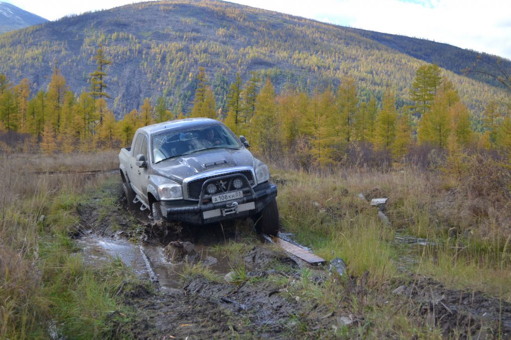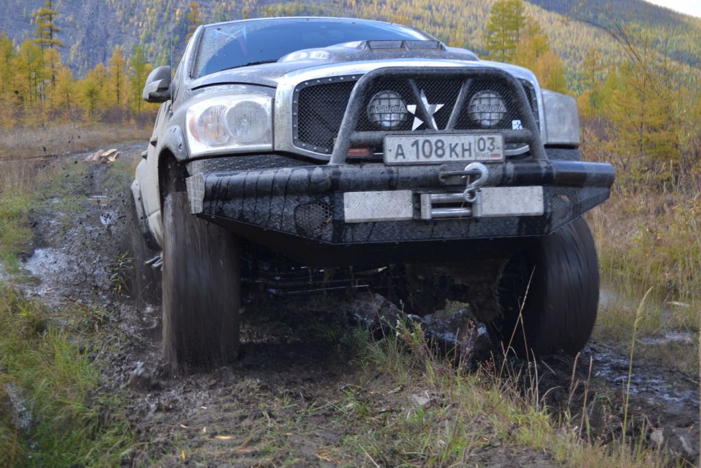 В эфире снова какая та котовасия. Толстый наткнулся на одиноко передвигающеюся машины мирно забегемотившеюся на дороге. В первом приближении ему даже не удалось определить марку машины. Только и услышали, что масса машины-бегемота как раз по мне и что она с кузовком. Издевок и юмора было много. Доберемся разберемся что к чему там. Нас то много. Выдернем. Веселимся и едем. Добираемся до точки где Толстый словил бегемота и млин млинский стоит корыто размеров с локомотив. По началу подумали, что тундра. Но чем ближе тем веселье становилось меньше. В кустах притаился всем бегемотам бегемот. Додж Рэм. Магента рисанулся и вытянул его в одну каску, пусть завидует что его малыш дернул. Все пошли пялятся на это чудо. Колесья гдето на 37с литьем на 20. Весь в обвесах сделанных на заказ. Это корытце прошло не слабый тюнинг.