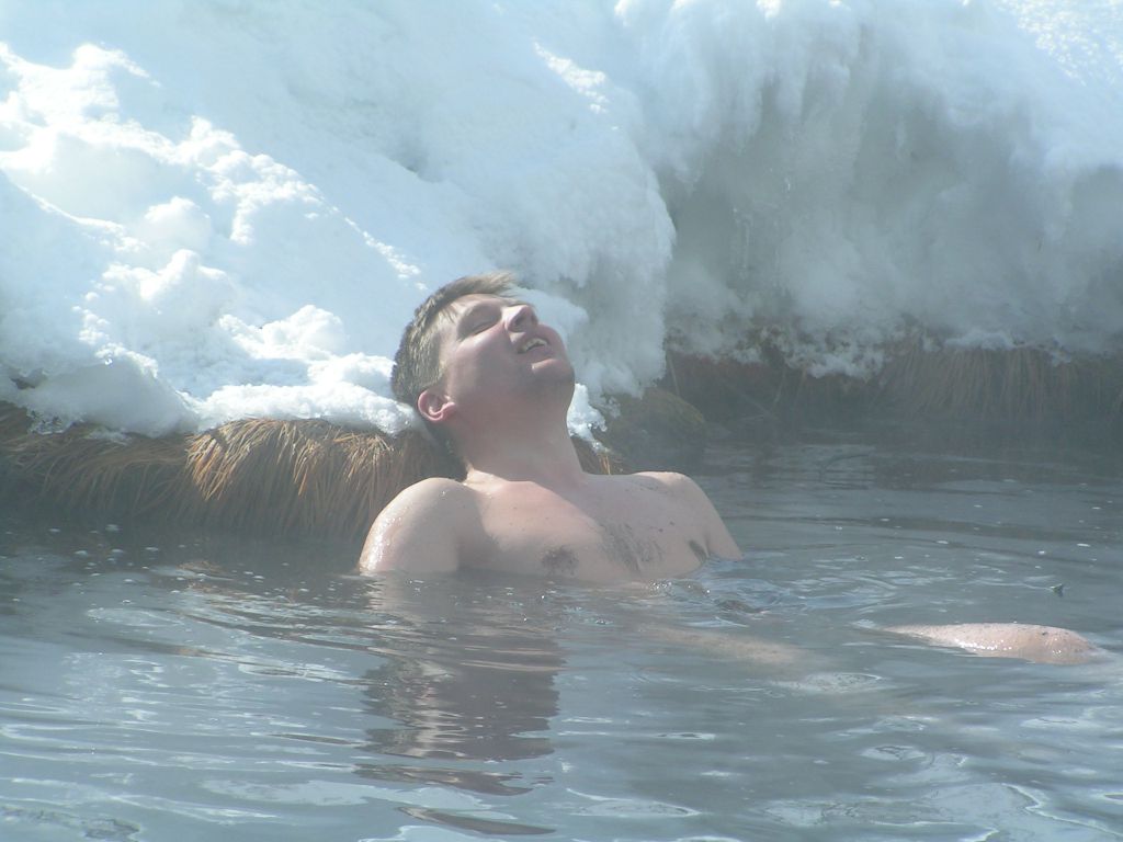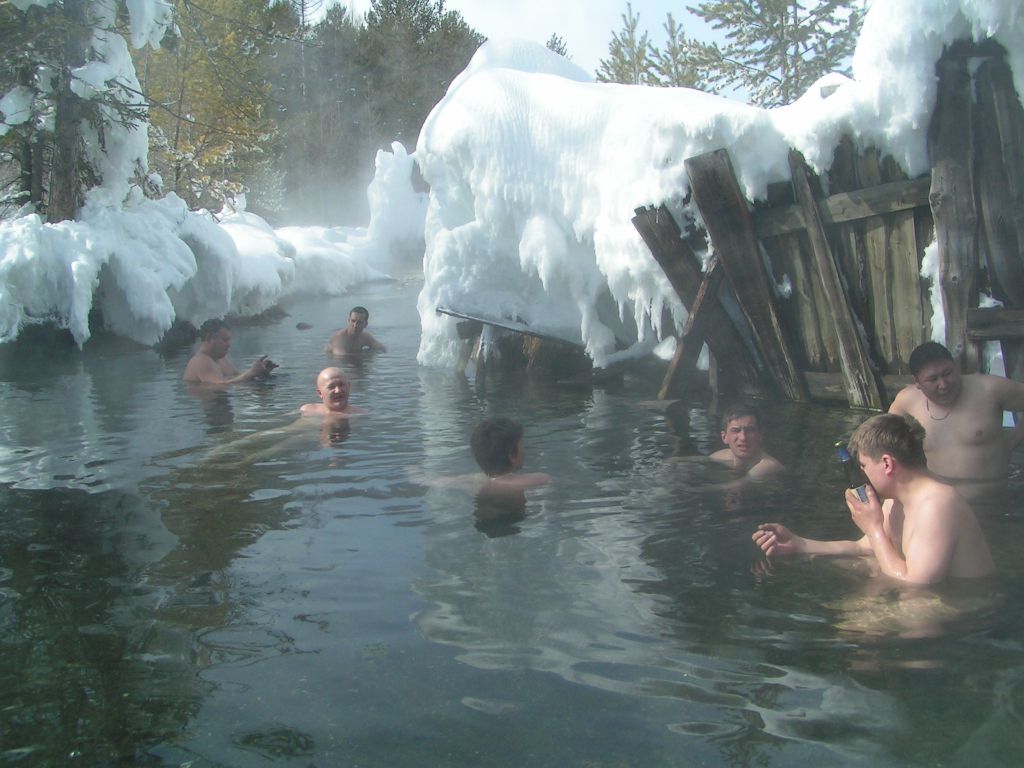 Ночь есть ночь… беру на себя роль Сусанина, кружимся по долине Могоя, наконец находим нужный отворот. Подъезжаем к источнику. Дом на месте, источники парят. Возле дома стоит датсун с читинскими номерами. Вламываемся в дом, будим хозяев. Мужик с женой и то ли тещей толи матерью. Половина участников нашла в себе силы принять обжигающе горячую ванну.