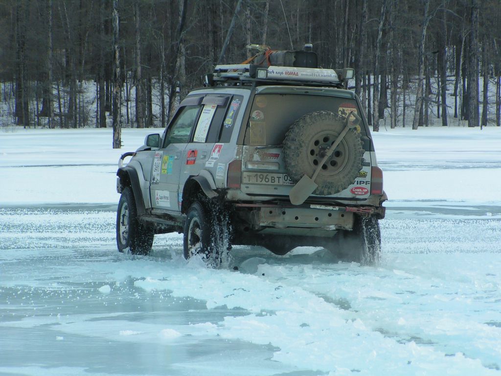Вниз по Ципе до м\с Ую 75 км. Вьем бесконечные петли – река сильно меандрирует. В устье р. Вековьё – первая наледь. «Здравсвтуй Вековье!» Дрифт в сумерках. Едем дальше. В устье Кандакана очередная наледь. Иду первым, вижу воду. Торможу, кручу руль. Машину заносит и она идет левым боком вперед. Потом левые колеса ломают лед и машина встает на два колеса и балансирует на грани «ушей» несколько долгих секунд. На багажнике 80 литров топлива…