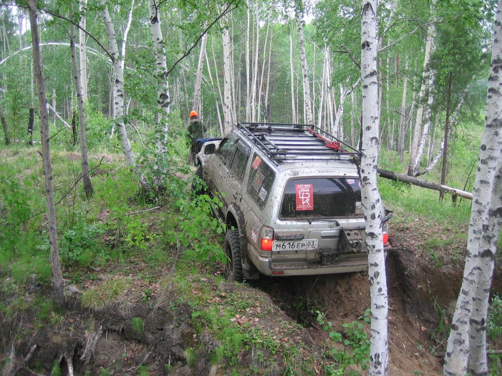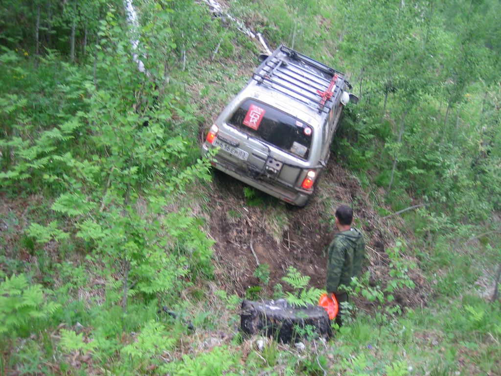 500 метров вниз и офигенный спуск. Вышли посмотреть. Круть пере круть. А внизу навалено деревьев, что хватит полгода дом топить. Назад дороги нет :). Достаем пилу. Она уже изрядно села. Тащусь вниз. Штурман снимает болотники. Он в них всю ночь и утро пробегал. Ноши в хлам. Надевает сапоги. я уже во всю пилю матерясь. Как будто специально навалили. Ровненько так лежат. Снова выкосил все. НА против на склоне оврага Сурфовский стачивает один из берегов чтобы спрыгнуть вниз. Пилить закончил. Полстатретий газик дров разлетается по соседним кустам, путь открыт. Ходить уже сложно. Хочется упасть и уснуть.