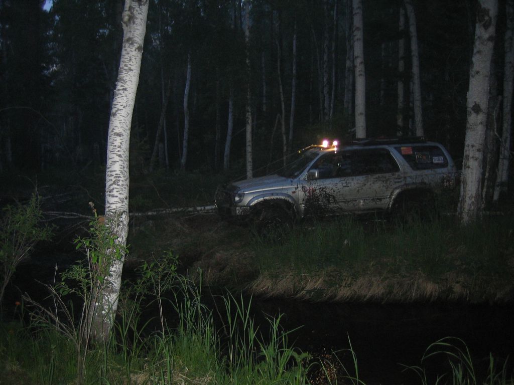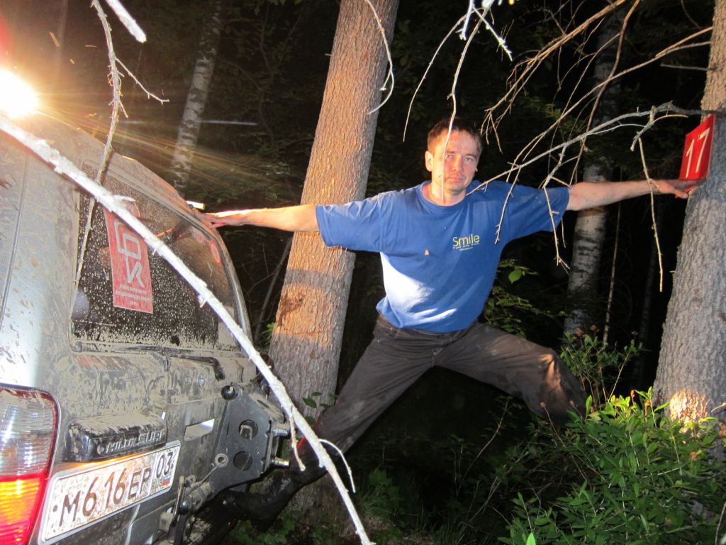 Молодцы, весело покатались.. А мы как-то монотонно и скучно ехали по большим перегонам от точки до точки, пока не доехали до однобальной точки. Увидели точку - обрадовались, забрали.. Значит верно идем.. Дальше в лес по заброшенной еле видимой колее и валежнику. В лесу ночью ехали тоже неинтересно - проехали, попились, проехали и снова попились... Пока под утро не сломалась пила.. Потом достали топор и стало весело и бодро - сон как рукой сняло.. потом устали руки и в ход пошол железный бампер и железные крылья, двери от Сюрфы. Сильно хотелось выехать на дорогу. Увидев все-таки в восьмом часу утра в 100 метрах впереди дорогу, плакали и катались по траве от щастья. Потом вдохновленно разнесли в щепки остатки валежника и выехали на дорогу... Дальше снова сбор точек и т.д.  Фоток к сожалению мало - успел пару раз сфотать в Колину смену, потом снова бежал выгонять дрему.