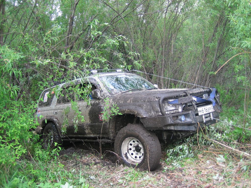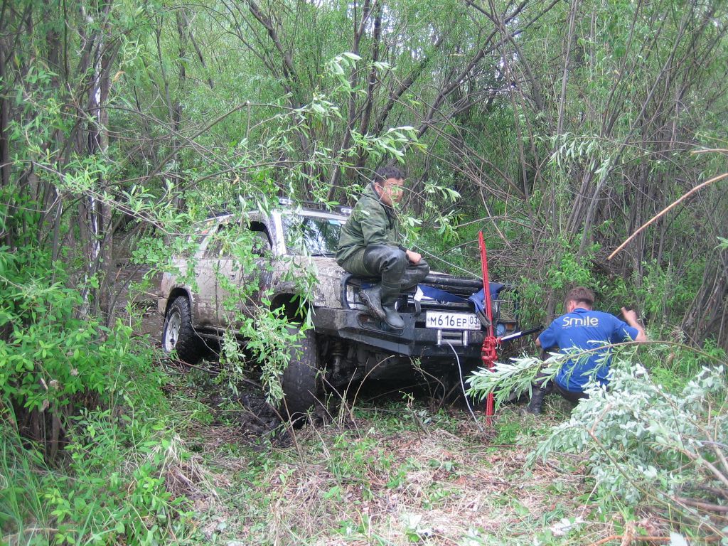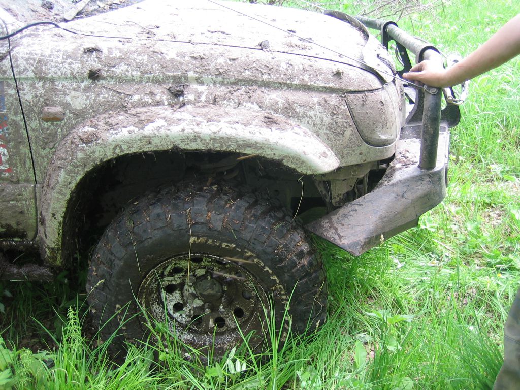 Может все сложилось и более положительно вози мы 6 и 50 точки. Но они такие веселые были, что наковавшись, напилившись леса уезжали дальше :). 50 точку с моими свесами вообще не реально взять :). Пытаясь забраться на бугор смял глушак и задний бампер. А так просто приключений было много на нашу задницу. Загнутый бампер передний не давал проехать нормально более 200 метров (приходилось его чуркой попровлять чтобы он в колесо не упирался) в итоге он был жестоко выгнут в обратную сторону лебедкой. И лебедка вообще раза 4 подвела. Трос вылетел из крепления на барабане и распушился и вернуть его на место так и не удалось, просто намотали побольше и закусили его (более 15 метров не выкручивался) и крюк один раз по неосторожности в ролики засосало. Короче весело. На точке где мы с тобой весь лес избегали ища точки я защиту оторвал :). Короче везде были свои "тонкости". На 17 (кажись) (сушина называлась) точке палено пробило защиту (пластиковую) и выгнуло переднее крыло изнутри :):):).