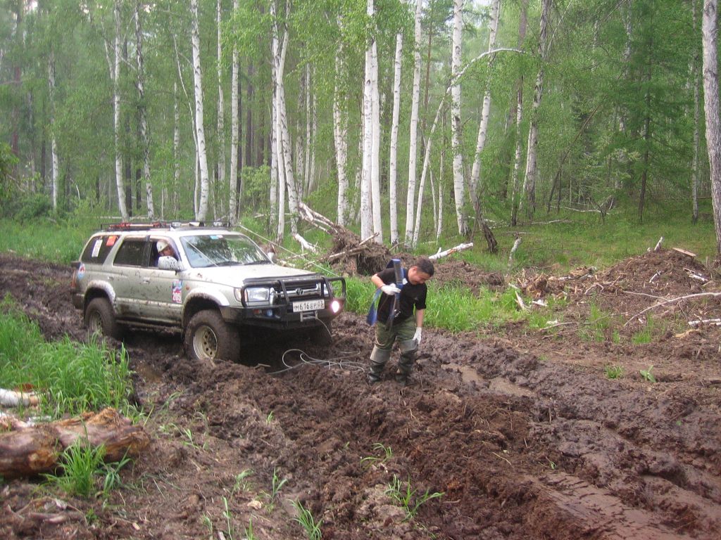 Еще три метра и вот уже краешек спасительной сухой дороги. Лебедимся третий раз
