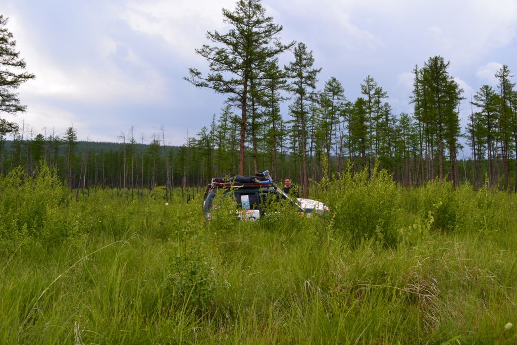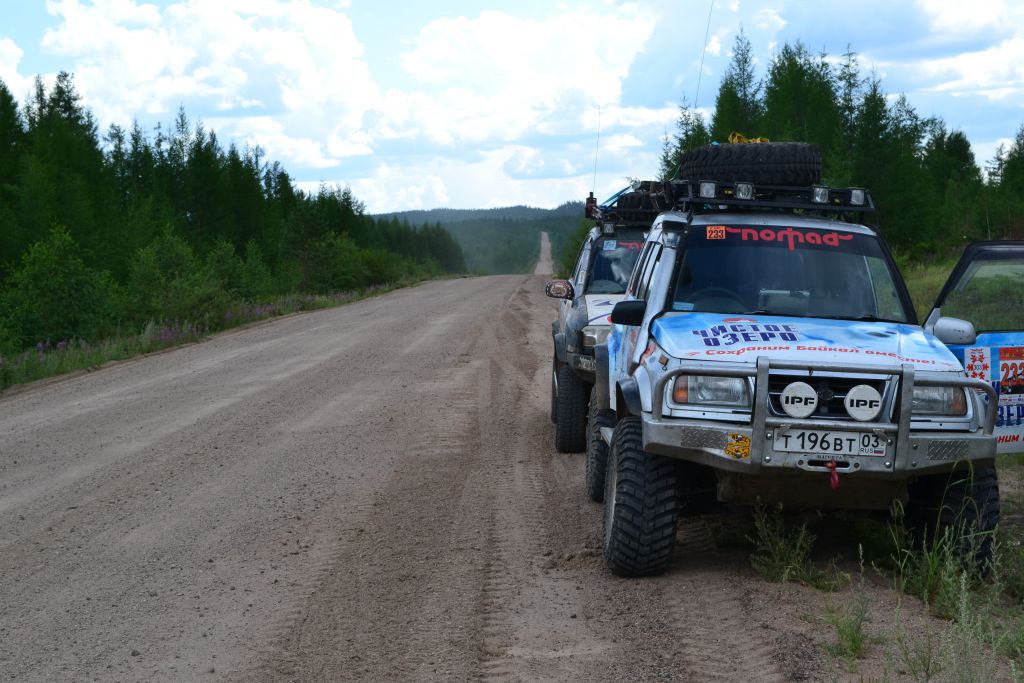 Ближе к багдаринскому асфальту начинается пыльная буря, а  при выходе на асфальт обрушивается стена ливня. В Багдарине заправка под  горлышко во все емкости. Едем на явочную квартиру, забираем  спутниковый телефон и переобуваем колеса.  Пока стояли на заправке проехал одинокий лысипидист, разговаривающий по  сотовому,  до ушей донеслась сказанная им  фраза «Тут опять по нашей деревне какие-то головары ездят!». Поржали.
