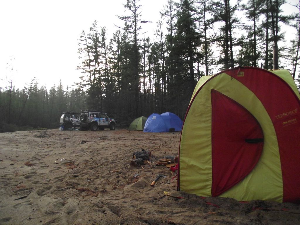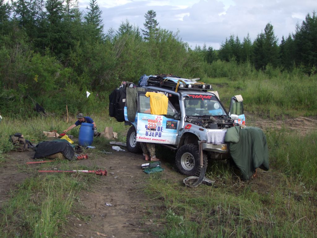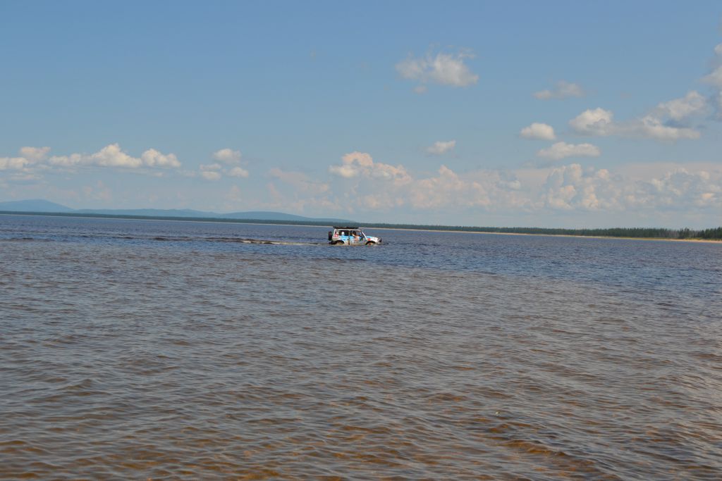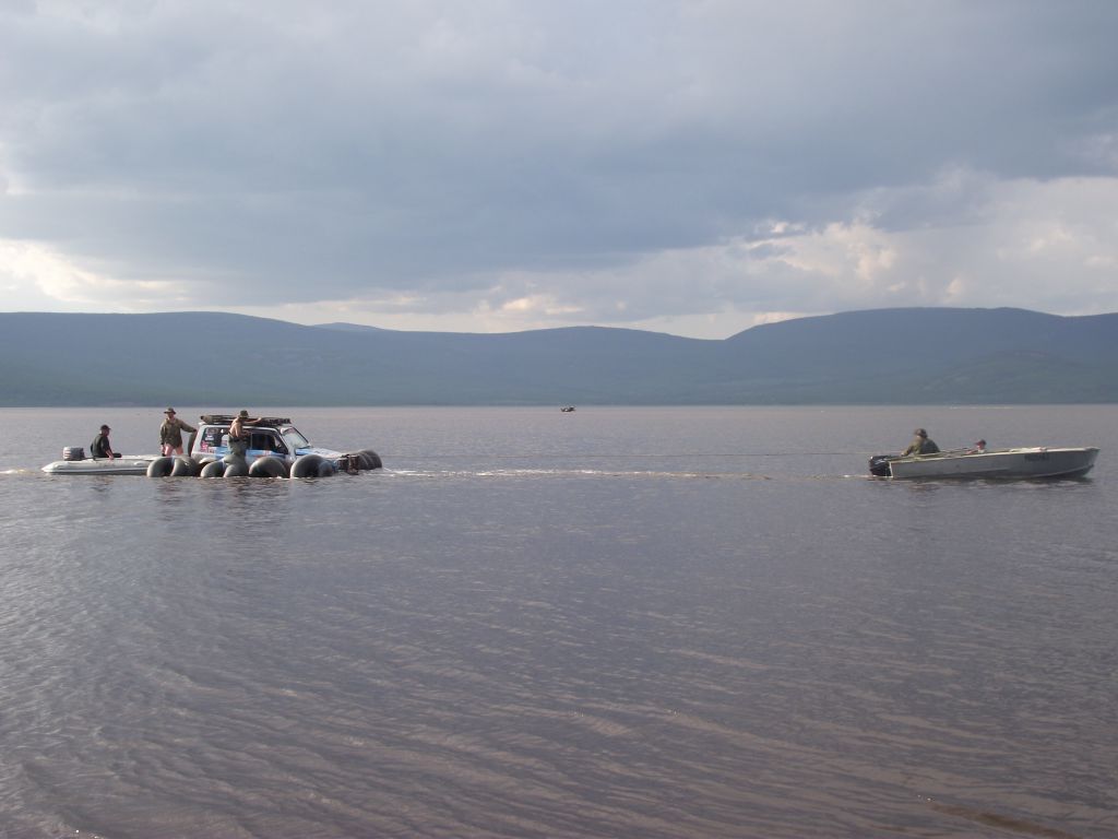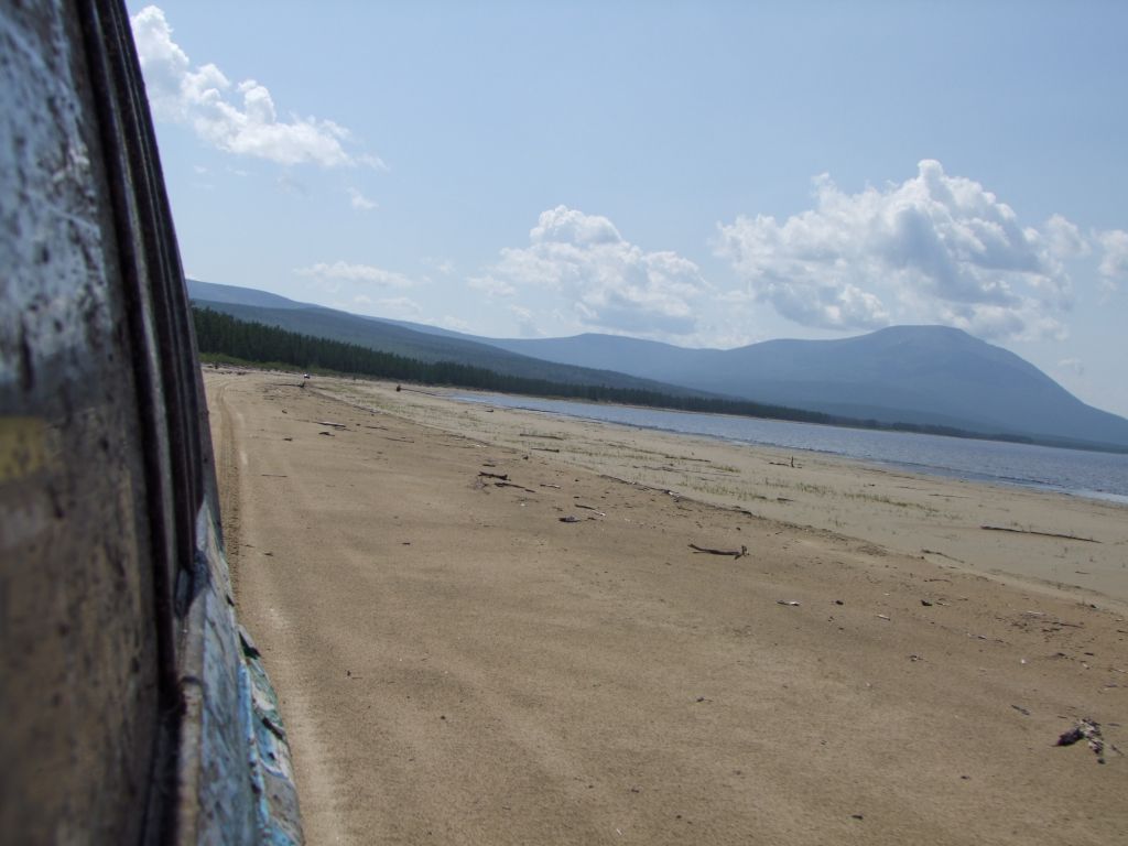 После ночного трофи-рейда настроение ниже планки. Приходят  мысли о том, что дальше вообще все будет плохо, раз даже на берег съехать не  смогли. Мысли о Могое  уже не такие яркие,  до баунтовских переправ бы доехать. На совете решаем по максимуму разгрузить  машины – ну очень ночной трофи рейд вымотал. Надуваем лодку, ставим мотор, в  нее шмурдяка кг 200 отправляем Патрона по Ципе   на побережье озере с переноской для связи. Сами опять на Переменчиху.  Там скидываем в кустах еще 200   кг железа с топливом, т.е. все запчасти, масла и вперед.  Едем! Не легко, но при свете и на облегченных по максимуму машинах, объезжая  засады по заболоченному ручью техника идет сама. Выезжаем на берег – и вот оно  счастье! Машина летит по песчаному