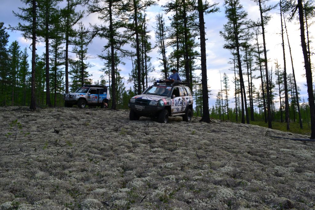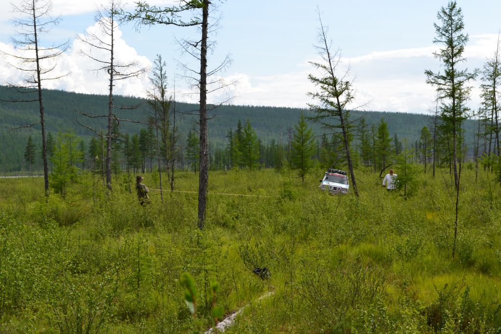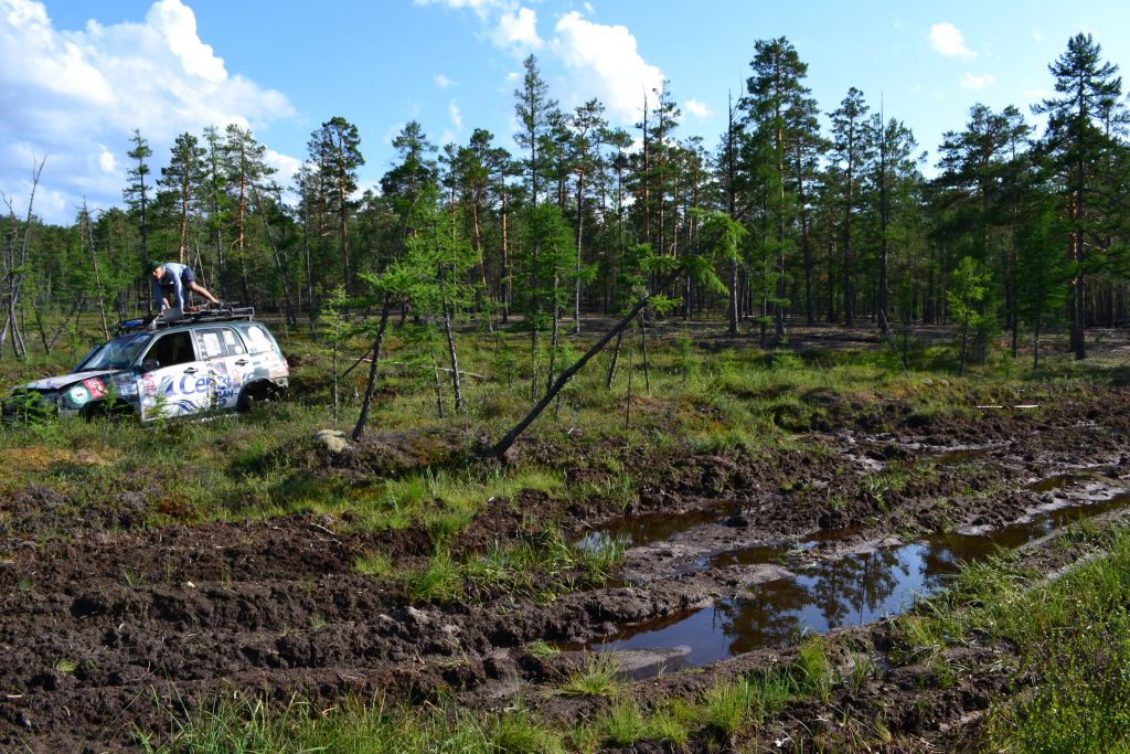 Первая пониженная до  самого вечера. Ерники, болото, моховина в разных сочетаниях, первая машина  часто прилипает, лебедим назад, пешком ищем объезд. Рутина.