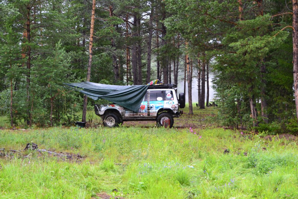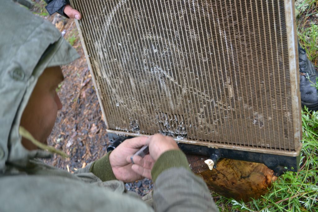 Меняемся радиаторами на машинах. Мне ставим целый, т.к. вентилятора  теперь нет, Сереге мой леченный. Снимаем мне капот для лучшей вентиляции,  подключаем на кнопку принудительно электрокарлсон кондея. Все работает. Вечером пытаемся  проехать до прииска, прилипаем пару раз, машем рукой, едем  лежать в источниках и спать.