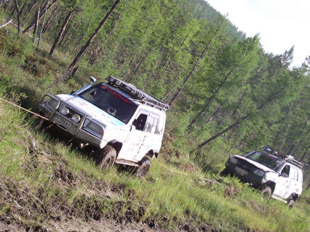 Мотос всегда идет первым, потому как без лебедки. Если он  подсаживается, я его дергаю назад  и начинаем  пешком искать объезд. Коля сидит у него сверху на багажнике и задает  направление движения, сверху видны камни и «нарезка». Я еду по проложенному  следу, чуть сбоку, потому как по прорезанной колее второй раз уже садишся.