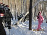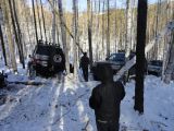 Тут ожидает Саббер с кипой бумаг. Забираем координаты и в путь уходим первыми. Хотя к промежуточному финишу черный эскудик приехал первым. Прём вперёд забивая на ходу координаты единственной точки. Уходим в гору. Вот оно горлышко пади. Девственная белизна снега. Видно что кто-то ходил но точно не ездил. Поставили себе задачу уделать Толстого. Поэтому не едим, а летим. Впереди какой-то буерак не пойми как ехать. Далеко не проехали. Рюхнулись в овраг. Висим. Раскамчиваем машину. Вжик-Вжик туда обратно, тебе и мне приятно. Но не приводу моста. Под снегом не видно камней. Цепляем камешек и сильный дзынь.  Что-то сломалось. Женька показывает пальцем, что колесико левое не крутится. При этом сзади Толсный благим матом орет, чтобы его перца пропусти. Шиш ему. Лебедку за сосну и медленно вылезаем из западни. Но не успеваем перекрыть дорогу. Бензопила Толстого обходит нас по обочине и он первый. Вылезаем из ямы и цепляемся ему в хвост. Пусть понервничает. На трех гребущих колесах едим не так уверенно. Но едем. Точка то рядом. Впереди развилка. Толстый сунулся направо и остановился, я перебрался через очередной овражек на лебедке и подпер его. Чтоб так сказать не сбег. Его штурман (Колек) метнулся сначала направо по дороге и видимо просёк, что не туда нам всем надо, побежал налево, а мы не долго думаю туда уже едем. И впереди этой назойливой бензопилы. Метров через 50 шлифуем снег и вперед уже не едем. До точки 450 метров. Толстый обнаглел в край и лезет на обгон справа где и муха не проскочит. Обтирает своей грязной машиной мою чистую запаску и задний фонарь. Честно сказать хотелось ему по фюзеляжу надавать. Вышел посмотреть чего этот отморозок наделал и как бы ничего такого страшного с виду. Но осадок остался. Догоню ноги вырву. Устремляемся за ним. Его счастье, что машина не едет, а еще и тормозит колесом с мертвым шрусом.  Впереди навалены деревья. Пока Бензопила бензопилой нам расчищает дорогу я по быстрому проверяю колесо на предмет, а вдруг это все же хаб умер. Скинул его. Ан нет. Все же привод. От руки болтается. Собираю все обратно. Пофиг так доедем ведь цель близка. Но это только по карте. Далее пошел не детский секс. Отметка 350 метров. Мы уже только на лебедке. Машина не едет. А скатывается вниз. Толстого уже не догнать. 300 метров на лебедке при том, что на барабане намотано всего 18м. Остальное все оборвано ранее и заменить было лень. Напоминаю что мы ехали отдыхать, а не биться как будто в последний раз. Далее нудный подъём на лебёдке. Женька уже вымотан. Постоянно закусывает кевлар и барабан лебедки сам не крутится только при помощи камаповского электродвигателя. До точки остаётся метров 50. На приборной доске тухнет все. Рация показывает 9.7 вольта. Офигеть. Дожил. Акум сдох. Машина на оборотах заряжает батарейку. 15 минут заряжаем 5 минут тянем. По 10 метров. Мучение но делать нечего. Снизу собирается пробка. Но меня то никак не обгонишь. Один отморозок который может меня обогнать где то впереди, остальные не поехали на эту покатушку :). Толстый к этому времени уже взял точку и ушуршал вниз. Мы все едем через подзарядку. До нашего бампера подтягиваются самые активные и обсуждают как бы объехать наше обездвиженное тело бегемота. Кавалькада уже не детская. Эскудики, уазки, стопятка и еще всякой мелочи на добрый десяток. А нас то не перепрыгнуть. Доползаем до точки ее у