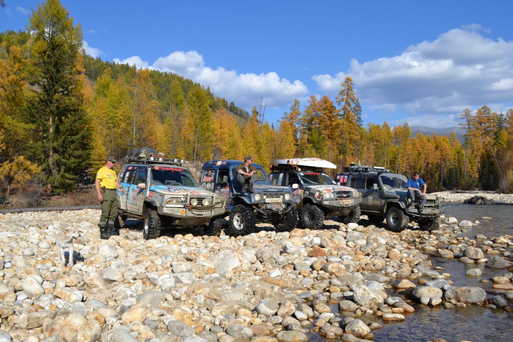 Дорога знакомая. Засадные места известны. Едем веселимся. На Срамной при преодолении брода, камешками был замят мой горячо любимый салярный бак. И по его виду литра на 3-4 он стал менее вместим. Плохо конечно, но хорошо, что нет течи и ехать можно. На последнем бродике Срамной на встречу идет группа граждан геологического вида. Проверяют дорогу. Нам бы тоже проверить и бак бы остался цел. Перед бродом стоит Урал. Ждет команды на отправление. На этом интересное закончилось. До 110 дохали без проблем и с ветерком. На всякий случай проверяем место засады Доджа. Вдруг найдутся детали его подвески. Безуспешно. Едем дальше по пути кушаем.