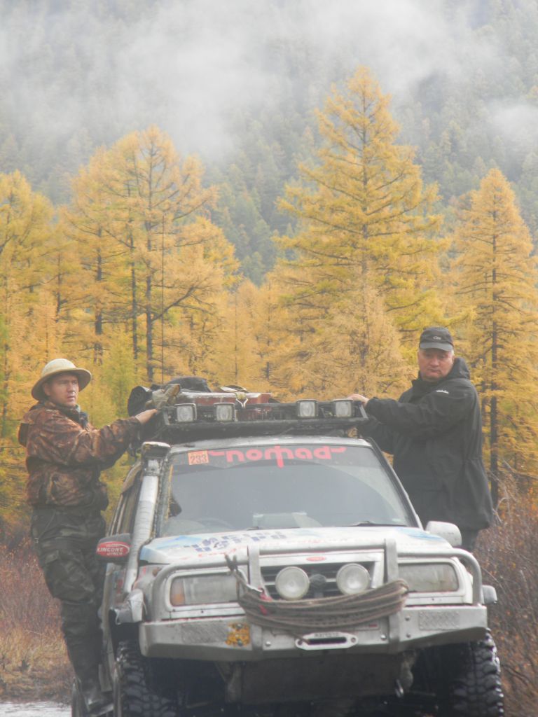 На следующее утро почти все, дружно собрались ехать домой, Толстый по старой традиции рань при рань ушагал первый. От общей колонны я оторвался так как надо было забрать запчасти прибывшие в Курумкан. Судя по брани в эфире, машины по дороге продолжали разваливаться. У Магенты рулевое перестало нормально функционировать, у Мотоса возникли проблемы с подвеской. Вобщем все как обычно. Без этого не интересно как-то. В Курумкане, забрав запчасти и сытно пообедав, ждали отставших. По итогу прибытия к нам, у Магенты лопнула рама в районе крепления гидрача, а у Мотоса окончательно развалился подшипник полуоси. И нагревался так что приходилось остужать его чуть ли не в ручьях и оторвался правый передний аморт. На въезде в Курумкан нашли СТО где первым починился Магента, а потом приполз Мотос и варварскими методами приварил Аморт и поменял полумертвую полуось.